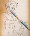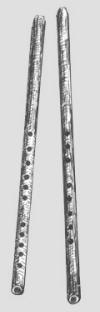 The borrindo is a hollow clay ball with three to four holes. The top hole is larger than the others, which should be of the same size. The holes are arranged in an isosceles triangular form. The borrindo is made of clay commonly available in most of the central Indus Valley, and is thus often used in Sindh. This simply constructed instrument is sometimes made by children in the region. Artisans make larger borrindos with intricate designs and fire the clay. The notes for music are produced by blowing across the largest hole, while fingering the smaller holes to produce specific notes (images and information from Baloch 1988). |